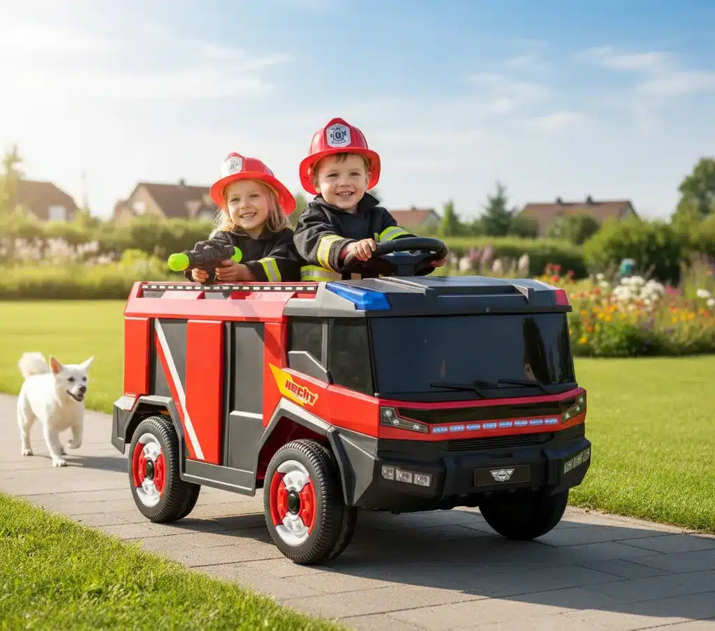 Igra, zvuk i akcija – električno vatrogasno vozilo s pravim plavim svjetlom, raspršivačem vode i integriranim priborom za male heroje.