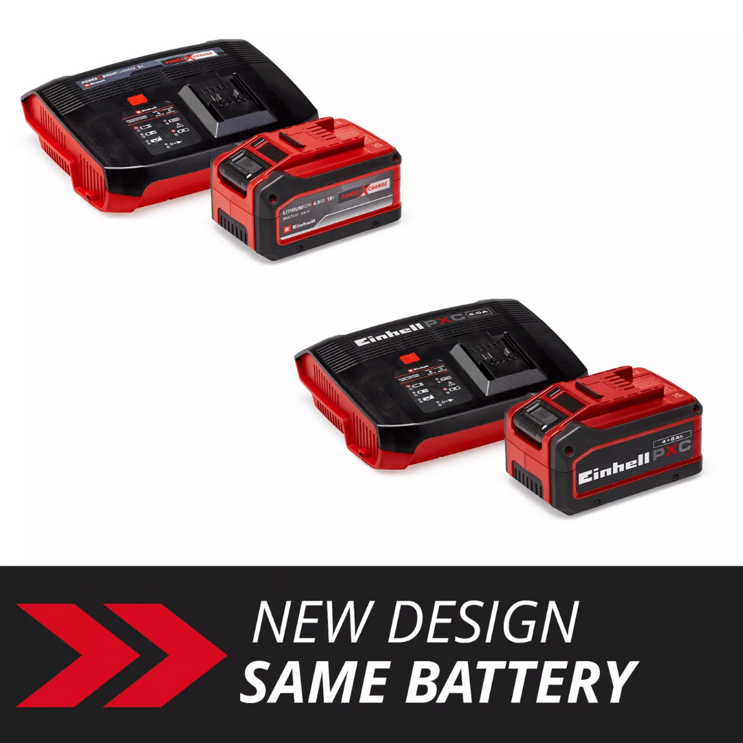 EINHELL set brzi punjač 6A Boostcharger i baterija 18 V 4-6Ah PLUS Starter Kit idealna je osnova za pokretanje ili proširenje asortimana Power X-Change u vašem domu. Starter Kit s punjivom baterijom Power X-Change Plus od 18 V 4-6 Ah i Power X-Boostcharger 6A član je višenamjenskog i potpuno izmjenjivog sustava punjivih baterija Power X-Change tvrtke Einhell.