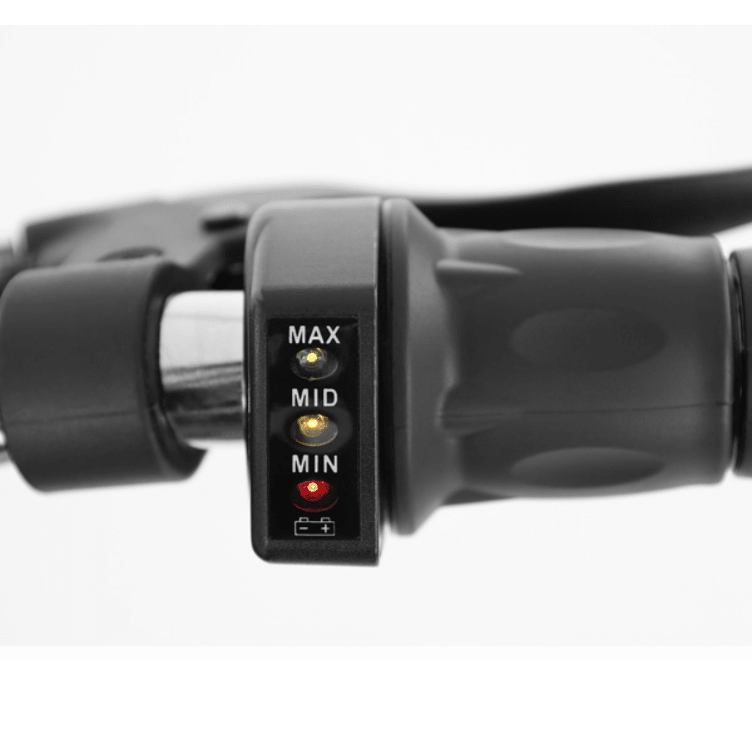 Brzina motocikla može se ograničiti i zaključati ključem na 7/15/25 km/h. Kočnice se upravljaju ručicama na upravljaču. Na desnom upravljaču nalazi se gas (ručica za gas) koja se može okretati za kontinuiranu kontrolu brzine. Pored gasa nalazi se LED ploča koja pokazuje razinu napunjenosti baterije. Široki, nazivni upravljači (tzv. šipke) osiguravaju udobno upravljanje. Za povećanje sigurnosti, nadopunjeni su mekom pjenastom navlakom u srednjem dijelu.