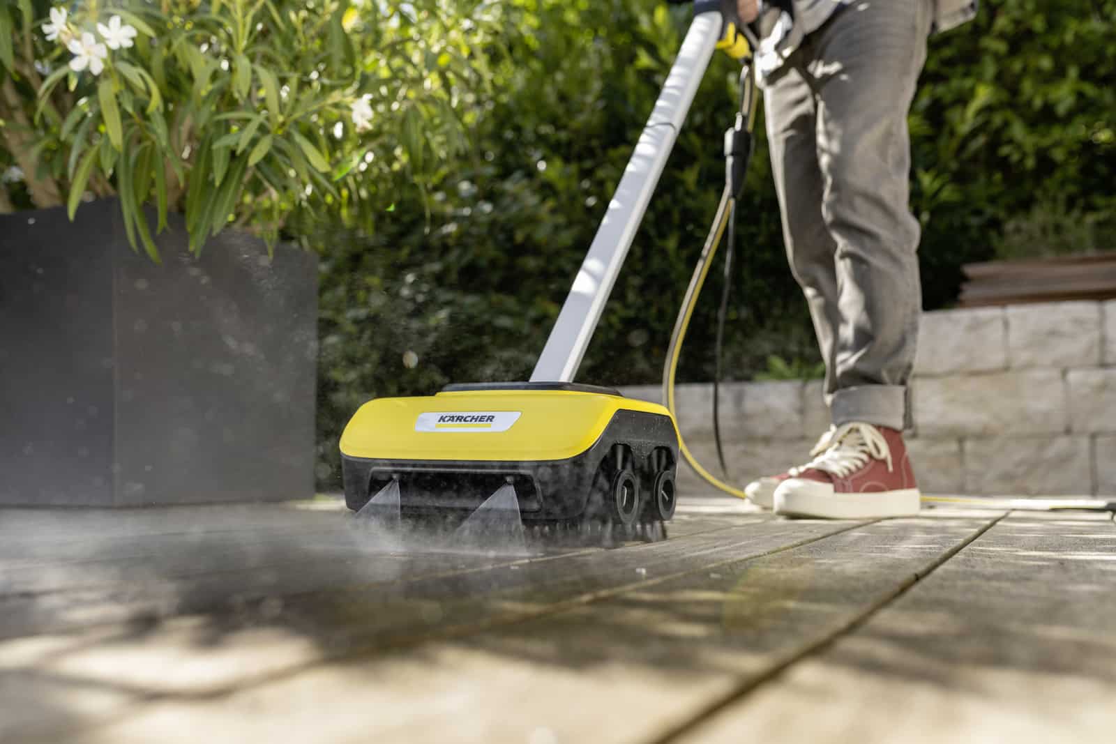 Električni čistač terase PCL 6 može se koristiti za izuzetno jednostavno, ravnomjerno, brzo i temeljito uklanjanje tvrdokorne prljavštine s drvenih terasa. Jednostavno spojite čistač na vrtno crijevo – i spremni ste za početak čišćenja. Zahvaljujući kombinaciji četiri rotirajuće valjkaste četke i podesivom dovodu vode, prljavština se može brzo i pouzdano navlažiti, a istovremeno se može pokupiti i odvesti. Svojim plutajućim efektom, čistač PCL 6 osigurava temeljito i bez napora čišćenje drvenih ili WPC terasa. Koristi se samo onoliko vode koliko je potrebno. Širina i položaj valjaka dizajnirani su tako da se dvije daske mogu očistiti do ruba u jednom koraku, što također štedi vrijeme. Zahvaljujući zamjenjivim valjcima, možete čistiti ne samo drvene i WPC podne obloge, već i glatke i fino porozne kamene pločice i ploče. Valjkaste četke za kamene površine nisu uključene u opseg isporuke.