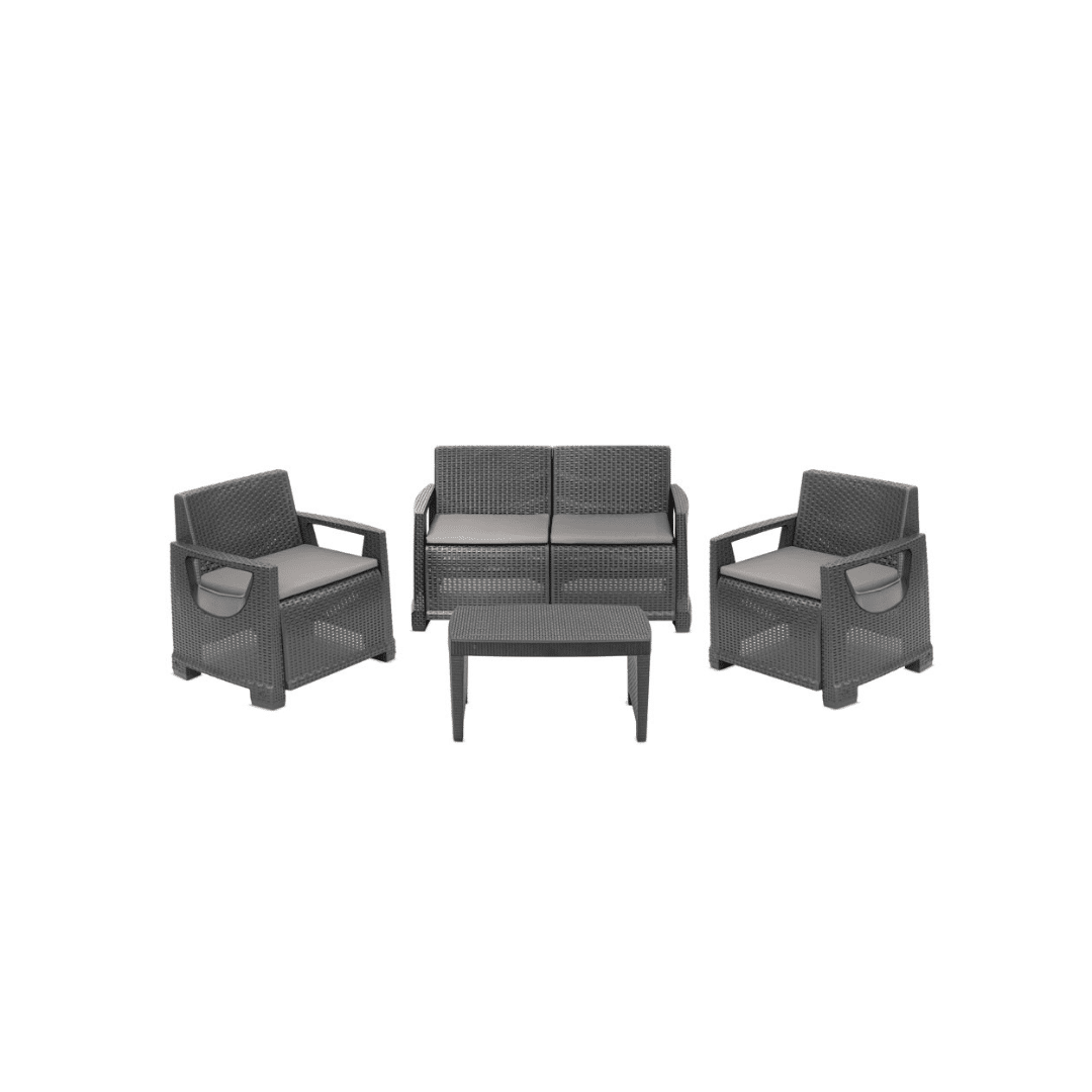 Vrtni set koji se sastoji od pravokutnog stolića za kavu, dvosjeda i dvije fotelje sa sivim jastucima.