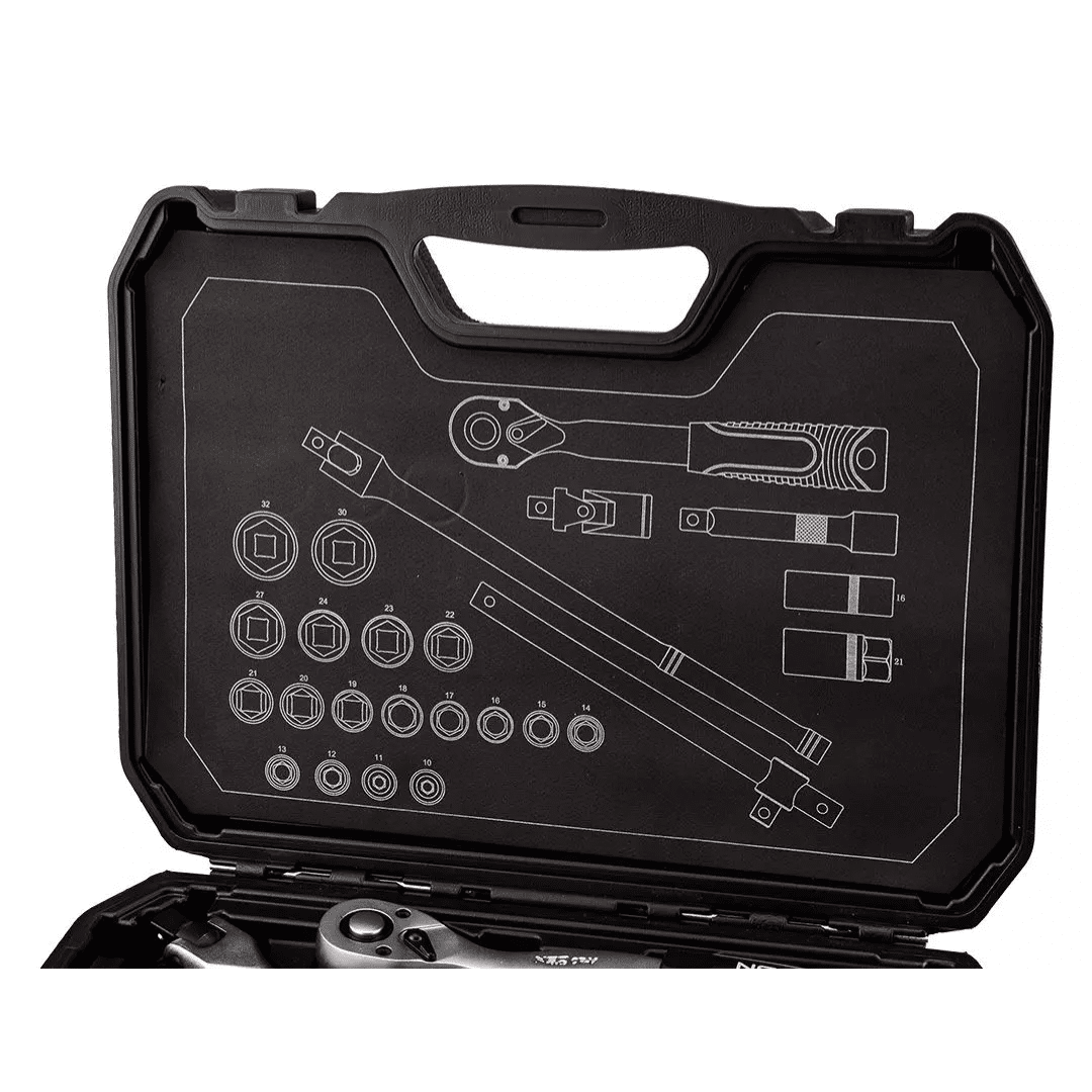 Set se sastoji od: ½” račve (precizni mehanizam račve sa 72 zuba), 18 komada ½” šesterokutnih nasadnih ključeva veličina od 10 do 32 mm, produžetka od 125 mm, univerzalnog zgloba od ½”, ručke od 250 mm, ručke od 375 mm i dva ½” nasadna ključa za svjećice – 16 i 21 mm.