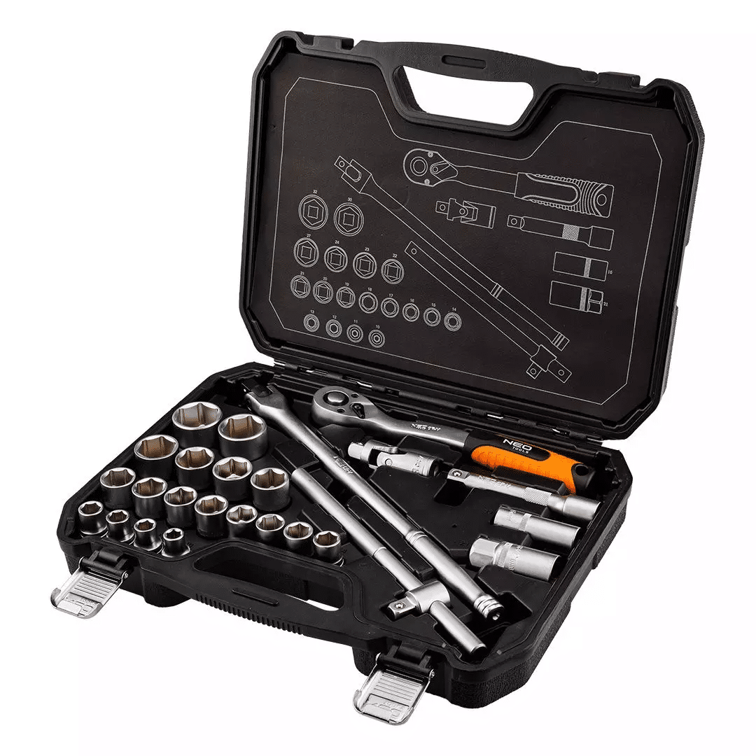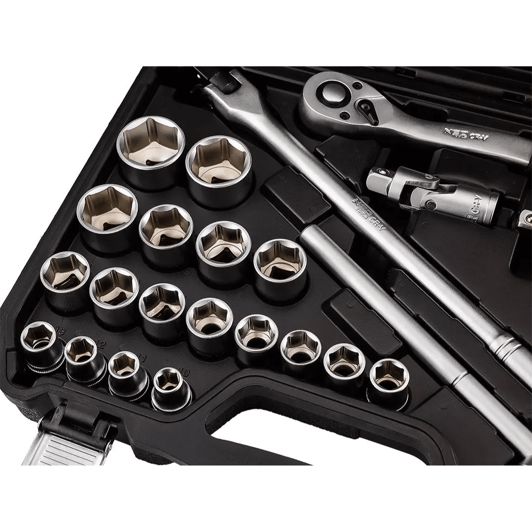Visokokvalitetni, višenamjenski set nasadnih ključeva od ½” koji sadrži 25 alata i pribora tvrtke NEO TOOLS.