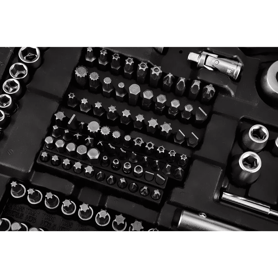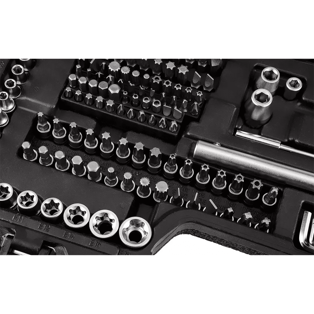 Set uključuje tri račve veličine 1/4 ” 3/8 ” 1/2  s preciznim mehanizmom račve sa 72 zuba koji omogućuje udoban rad čak uskim teško dostupnim prostorima Sveobuhvatan set nasadnih ključeva bitova pribora omogućuje osnovne napredne zadatke montaže popravka .