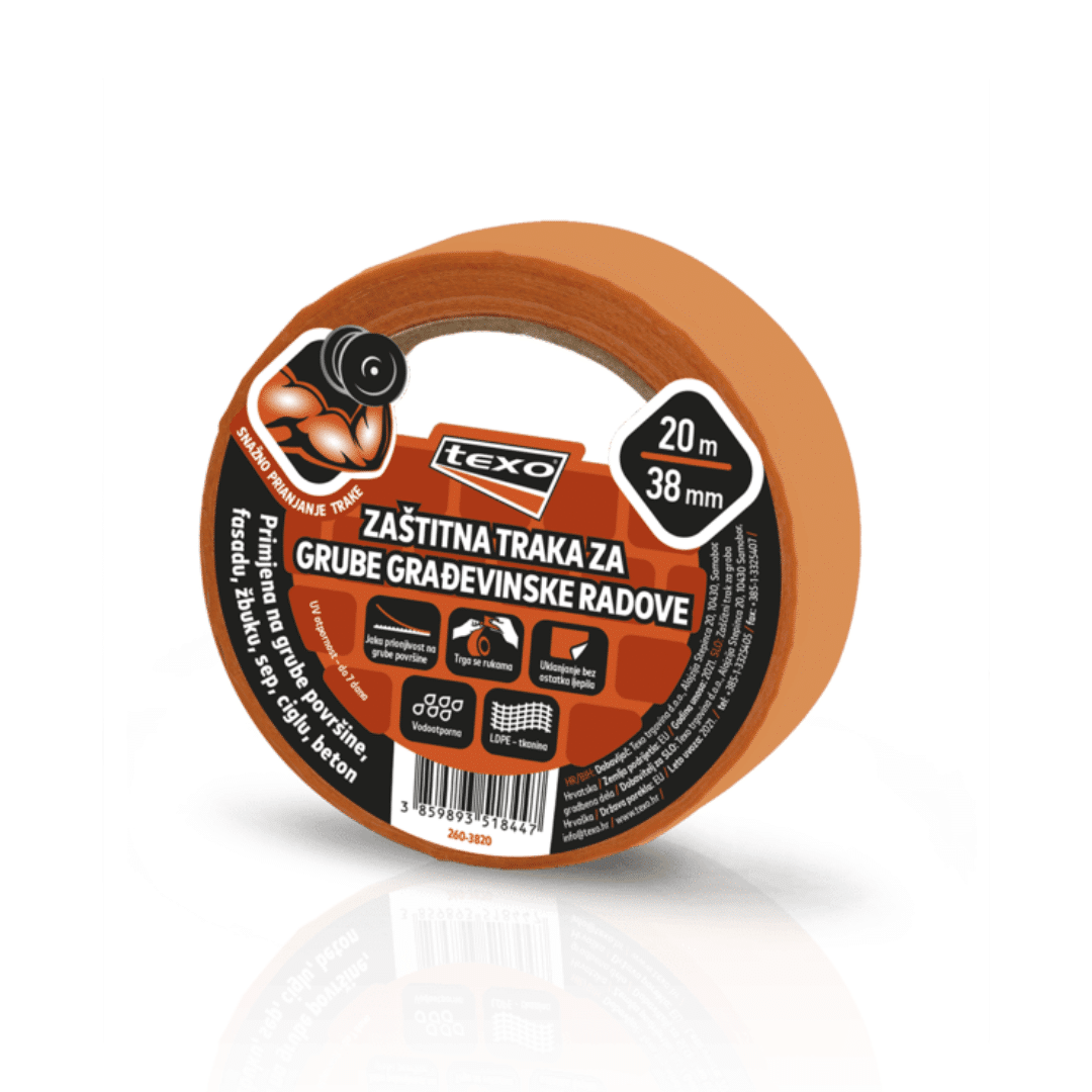 Texo zaštitna traka za grube građevinske radove idealna je za primjenu na grube površine u građevinarstvu, kao fasade, žbuke, sep, ciglu i beton.