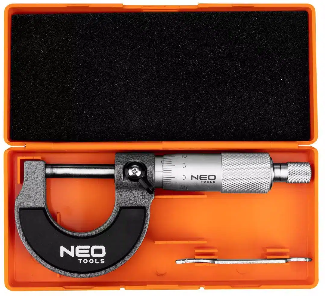 Precizni nonijus mikrometar 0 – 25 mm marke NEO , preporučuje se za mjerenje geometrijskih dimenzija predmeta s točnošću od 0,01 mm. Uređaj se preporučuje za svaku radionicu, auto servis ili industrijski pogon. Također korisno kod kuće tijekom renoviranja ili manjih popravaka. Nudi preciznije rezultate od popularnih čeljusti. Mikrometar marke NEO odlikuje se visokom kvalitetom izrade i glatkim radom bubnja . S obzirom na to da je opremljen praktičnom spojkom za pritiskanje elementa, savršen je za stolariju. Karakterizira ga duljina od 140 mm, širina od 60 mm i visina od 25 mm. Nudi se u kompletu s ključem za nuliranje i praktičnom plastičnom kutijom za praktično pohranjivanje alata. Primjena za mjerenje geometrijskih dimenzija predmeta, osnovni alat u autoservisu, radionici ili industrijskom pogonu, za upotrebu u stolariji, potreban kod kuće tijekom renoviranja i manjih popravaka. Značajke proizvoda mikrometar s nonijusom, točnost mjerenja ± 0,01 mm, visoka kvaliteta, jednostavan za korištenje, čitljiva skala/nonius, glatki rad bubnja, precizno mjerenje. Dimenzije duljina: 140 mm, širina: 60 mm, visina: 25 mm. Set sadrži mjerni instrument marke NEO, nulti ključ, plastična kutija.