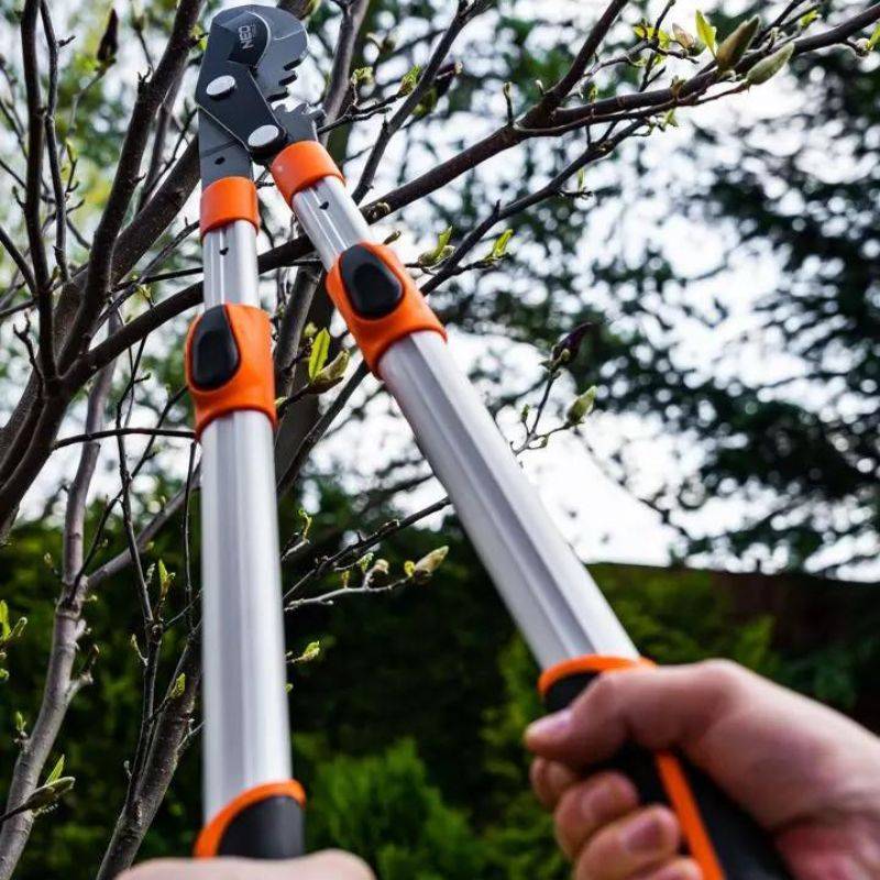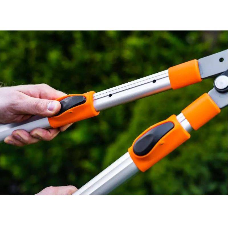 Vrtne teleskopske škare 665-965 mm NEO (15-253) opremljene dugim, laganim teleskopskim rukama, koje omogućuju da se dosegne dalje ili više biljke. Maksimalni promjer rezanja je 42 mm. Alat karakterizira prijenos nazubljenom polugom, čime se sila pritiska povećava za 40%, čime se olakšava i ubrzava rad. Oštrice s premazom protiv prianjanja i oštrica dizajnirana za svježe drvo čine reznicu otpornom na tekuće biljne sokove koji se ne talože na metalnoj površini i time ne usporavaju čišćenje u vrtu. Još jedna vrlo važna prednost ovog alata je mala težina, zahvaljujući aluminijskim krakovima, ali i posebno dizajniranim ručkama. Oblaganje protukliznim bimaterijalom utječe na sigurnost obavljanja aktivnosti i povećava sigurnost rada. Osim toga, ovaj model je opremljen opcijom teleskopskih ruku, čime se povećava doseg ruku. Alat se može produžiti do konačnih 965 mm.